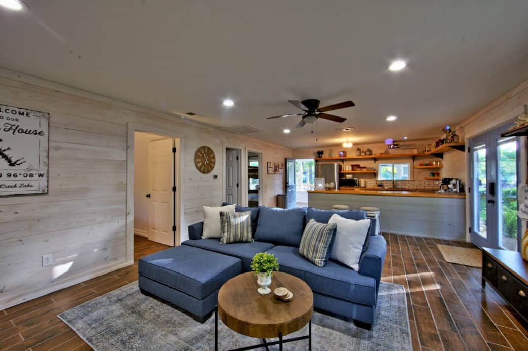 TV includes Hulu, Netflix, Disney Plus. Fireplace has electric insert for heat.